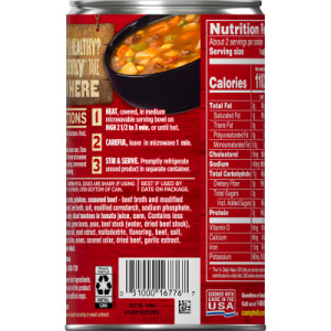Campbell’s® Chunky® Healthy Request® Old Fashioned Vegetable Beef Soup isn’t just tasty—it's made to work as hard as you do. With never-ending big flavors and bold ingredients, this canned soup is capable of fueling even the heartiest appetite. This ready-to-eat beef vegetable soup overflows with big pieces of tender lean beef along with hearty veggies like carrots, potatoes, celery, corn and peas. Each can has 15 grams of protein. It Fills You Up Right®. Just pop this ready-to-serve soup in a microwave-safe bowl, heat and enjoy with your favorite sides. Or, warm it over the campfire on your outdoor adventures. Whether you’re looking for quick and easy to microwave soup for home or something to take on the go, Campbell’s® has you covered. The soup can is recyclable for easy disposal. Take on the great outdoors with Campbell’s® Chunky® Healthy Request® Old Fashioned Vegetable Beef Soup—Soup That Eats Like a Meal®.