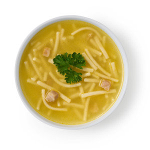 Tender egg noodles and diced chicken in a rich chicken stock seasoned with garlic.