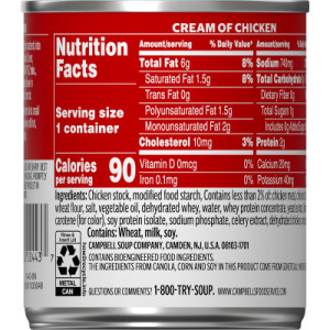 CHICKEN STOCK, MODIFIED FOOD STARCH, CONTAINS LESS THAN 2% OF: CHICKEN MEAT, CHICKEN FAT, CREAM (MILK), WHEAT FLOUR, SALT, VEGETABLE OIL, DEHYDRATED WHEY, WATER, WHEY PROTEIN CONCENTRATE, YEAST EXTRACT, FLAVORING, BETA CAROTENE (FOR COLOR), SOY PROTEIN ISOLATE, SODIUM PHOSPHATE, CELERY EXTRACT, DEHYDRATED CHICKEN, ONION EXTRACT. CONTAINS: WHEAT, MILK, SOY