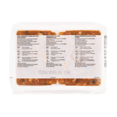 THIS PRODUCT HAS NOT BEEN FULLY COOKED BEFORE FREEZING. CAREFULLY FOLLOW THE RECOMMENDED COOKING TIMES AND TEMPERATURES TO ENSURE COMPLETE COOKING. Cooking Directions: This product may be tempered up to 48 hours in a 40 degrees F. refrigerator prior to cooking. Peel back plastic film starting from one edge. Keep film to view cooking directions. 1. If soup is frozen, run knife around soup blocks in trays to loosen. Empty the 2 trays of soup into large saucepot. 2. Fill both of the trays with water (64 fl. oz. in total). Add to saucepot. 3. Heat to a boil over medium-high heat, stirring frequently. Reduce heat to low. Boil gently, stirring frequently to break up any frozen pieces, until temperature reaches 190 degrees F. 4. Transfer to holding kettle or steam table.