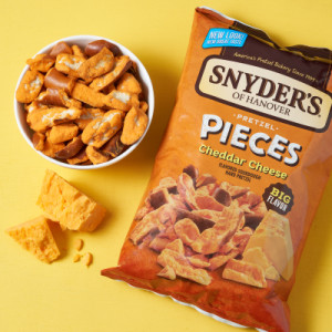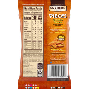 What do you get when you break chunks of our famous Sourdough Pretzels and coat them in delicious bold cheese? You get our famous Snyder's of Hanover Cheddar Cheese Pretzel Pieces. Generous chunks of our Sourdough Hard Pretzels deliver the yum of aged cheddar cheese. This bag is bursting with flavor to satiate your taste buds.