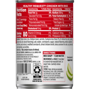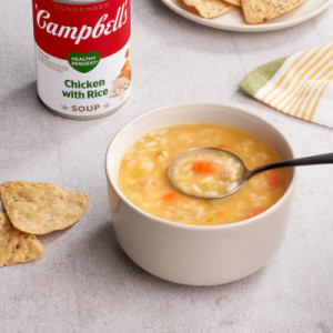 Campbell’s® Condensed Healthy Request® Chicken with Rice Soup is the comforting chicken with rice soup you love developed with your family’s health in mind. Each heart healthy* can has 0 grams of trans fat and 50% less sodium than our regular product**. Crafted to warm you inside and out, we perfectly season our golden chicken broth and add rice, and tender chicken raised without antibiotics. The end result is a soul-warming chicken with rice soup that brings a smile with every spoonful. Campbell’s® Healthy Request® Chicken with Rice Soup warms you up while delivering feel good comfort. Share the warmth: this easily customizable soup is the perfect easy addition to your weeknight family dinners. Find comfort in this trusted pantry staple — there’s nothing like it. M'm! M'm! Good!® *While many factors affect heart disease, diets low in fat & cholesterol may reduce this risk of this disease. **390mg sodium per serving vs. 790mg in our regular chicken with rice soup. From Chicken Noodle to Tomato and everything in between, Campbell’s makes delicious soups with quality, farm-grown ingredients in flavors you and your family know and love. Whether Campbell’s Condensed canned soups are the start of great recipes or you want to simmer down with the perfect bowl, we have a soup that everyone can enjoy.