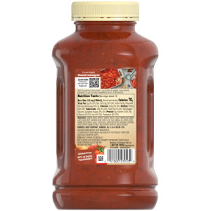 Be the hero at dinner with Prego® Italian Tomato Sauce Flavored With Meat. Versatile and delicious, this classic red sauce features the rich, sweet taste of vine-ripened tomatoes balanced with flavorful meat, herbs and seasonings. This pasta sauce with meat has a taste everyone loves and a thick texture that doesn’t water out, making it a perfect pairing with any pasta. This Prego® pasta sauce is gluten free and made almost entirely of vegetables for a spaghetti sauce you can feel good about. Each half cup serving of this pasta sauce provides 40 percent of your daily vegetables, giving you a sauce that’s as nutritious as it is tasty. Top off any pasta with this Prego® meat sauce for a quick, family-pleasing meal, or use it as a base for your favorite recipes. The tomato sauce jar top is easy to close and store in the refrigerator for leftovers. Give your family the taste everyone loves with Prego®.