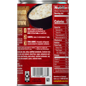 Campbell’s® Chunky® Healthy Request® New England Clam Chowder is a bowl of creamy comfort that keeps you coming back for more. Heart-healthy (1) and big in flavor, this rich, hearty soup showcases the authenticity of its East Coast recipe in every bite. This delicious soup is crafted with generous pieces of succulent clam and hearty potatoes. Each can has 11 grams of protein (2). It Fills You Up Right®. Just pop this soup into a saucepan or microwave-safe bowl, heat and enjoy. Kick it up a notch by pouring this hearty chowder into a bread bowl. Whether you’re looking for quick and easy microwave soups for home or something to take on the go, Campbell’s has you covered. The soup can is recyclable for easy disposal. Take on the great outdoors with Campbell’s® Chunky® Healthy Request® New England Clam Chowder—Soup That Eats Like a Meal®. (1) While many factors affect heart disease, diets low in saturated fat and cholesterol may reduce the risk of this disease. Meets healthy and heart disease claim on 1 cup serving (2) See nutrition information for sodium content.