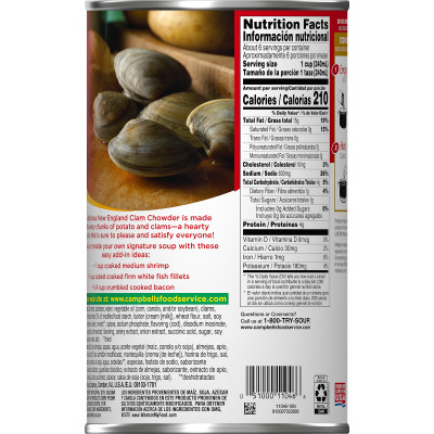 Savor the traditional flavors of the seaside coasts with Campbell’s® Ready To Serve New England Clam Chowder. Bites of potatoes and succulent clams are simmered in a clam stock with cream and spices for a mouth-watering bowl.