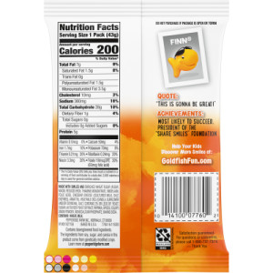 - PRODUCT BENEFITS: Goldfish Crackers are baked with real cheese and contain 0g trans fat per serving. This pouch contains 200 calories.