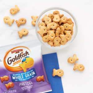 Goldfish® pretzel snack crackers with a traditional pretzel flavor baked with 10 grams of whole grain per serving with no artificial flavors or preservatives. This is a great snack that kids love, in a single serve .75 ounce portion size!