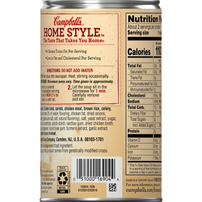 Enjoy quality flavors that feel like home with Campbell’s® Homestyle Healthy Request® Chicken with Brown Rice Soup. Every spoonful of this chicken soup is crafted with the simple, delicious ingredients you grew up on. This homestyle soup is made with tender chicken meat and hearty brown rice, carrots and celery for that familiar taste that’s sure to be a family favorite. Just heat in a covered microwave-safe bowl for up to three minutes, let sit for one minute and enjoy. This hearty chicken soup is perfect for nostalgic lunches at the office or part of family dinners at home. Each soup can is non-BPA lined and easily recyclable. Journey back home with every spoonful of Homestyle Healthy Request® Chicken with Brown Rice Soup, crafted from a place you trust—Campbell's®.