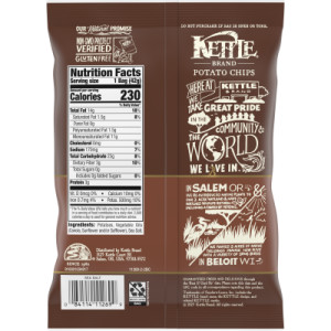 Kettle Brand Sea Salt kettle chips start with a search for undisputed potato excellence. And these babies are something special. Determined not to disrupt the flawless, spudsy goodness of these beauties, they’re cooked to perfection, skin on, one batch at a time until golden. Finally, each potato chip is sprinkled with a gentle kiss of sea salt. It takes pretty high standards to achieve Kettle Brand chips’ amazing crunch and flavor – quality ingredients make a difference. When you open a bag of our Kettle Brand potato chips, you know you're getting incredible-tasting kettle chips made with authentic recipes by real people. From their farms to our kitchens and then to your home, the time and attention every Kettle Brand worker puts into their products is care you can trust. All that, plus Kettle Brand chips deliver a delicious snack that’s non-GMO Project Verified, and Certified Gluten-Free. These 1.5-ounce snack bags of kettle chips are great at home or on-the-go. Kettle Brand potato chips. Extra in a good way.