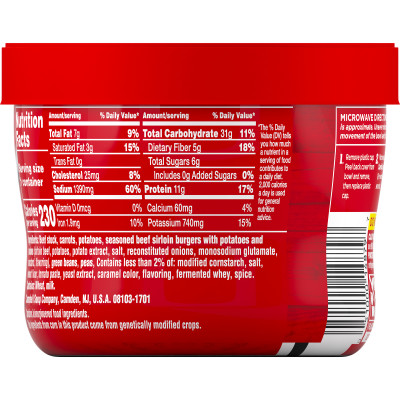 Campbell’s® Chunky® Sirloin Burger With Country Vegetable Beef Soup isn’t just tasty—it's made to work as hard as you do. With never-ending big flavors and bold ingredients, this soup is capable of fueling even the heartiest appetite. This ready-to-eat beef vegetable soup is crafted with seasoned beef, potatoes, carrots and other country vegetables for loads of flavor. Each bowl has 11 grams of protein. It Fills You Up Right®. Just open the microwaveable soup bowl and pop it in the microwave when you're hungry and crunched for time. Whether you’re looking for quick and easy to microwave soup for home or something to take on the go, Campbell’s® has you covered. Enjoy Campbell’s® Chunky® Sirloin Burger With Country Vegetables Soup—Soup That Eats Like a Meal®.