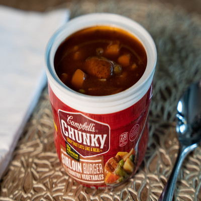 - Campbell's® Chunky® Soup: Eight (8) 15.25 oz microwavable bowls of Campbell’s® Chunky® Sirloin Burger With Country Vegetable Beef Soup
