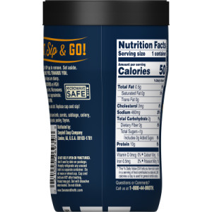- Each single-serve cup of chicken broth contains 10 grams of protein* and 50 calories (*Not a good source of protein)