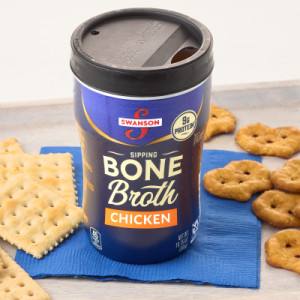 Sip and savor the goodness of Swanson® Sipping Chicken Bone Broth. We simmer a mix of chicken stock, real bones, vegetables, herbs and spices to create a savory bone broth with rich, full-bodied flavor. Made with 100% natural, non-GMO ingredients, Swanson® sipping bone broth is a simple yet flavorful way to add collagen protein to your diet. Each single-serve cup of chicken broth contains 10 grams of protein* and 50 calories. (*Not a good source of protein)