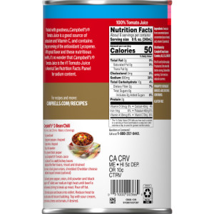 Experience a delicious blend of taste and nutrition with Campbell’s® 100% Tomato Juice. Crafted with juicy, vine-ripened tomatoes picked at peak season, Campbell’s® tomato juice has the rich and consistently smooth flavor you enjoy and expect from America’s No. 1 brand. Packed with goodness, each 8 fl oz serving of this 100% juice is a good source of Potassium and Vitamin C and contains 20mg of the antioxidant Lycopene. Our tomato-based vegetable juice is also gluten-free, non-GMO and vegetarian. Enjoy it on its own, over ice with a twist of lime, or seasoned with pepper and adorned with your favorite garnishes. It’s great as a breakfast drink or afternoon snack and makes a perfect mocktail or cocktail mixer. In addition to sipping it as a vegetable drink, you can also use Campbell’s® 100% Tomato Juice to add flavor and nutrition to a variety of dishes. Try it as a tomato sauce or tomato soup base, add it to homemade chili, or use it as a marinade for meat and vegetables. With great flavor and nutritious benefits, it’s no wonder why Campbell’s® is the No. 1 tomato juice in America.