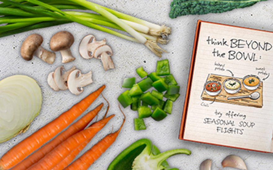 Consider offering soup flights, giving you the opportunity for incremental sales and guests the chance to try more seasonal flavors. Also, by offering soup flights that are a taste of the season, you can demonstrate your seasonal relevance.